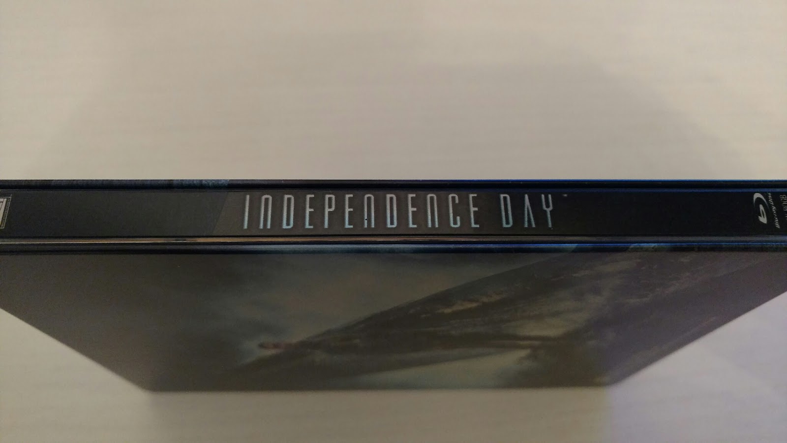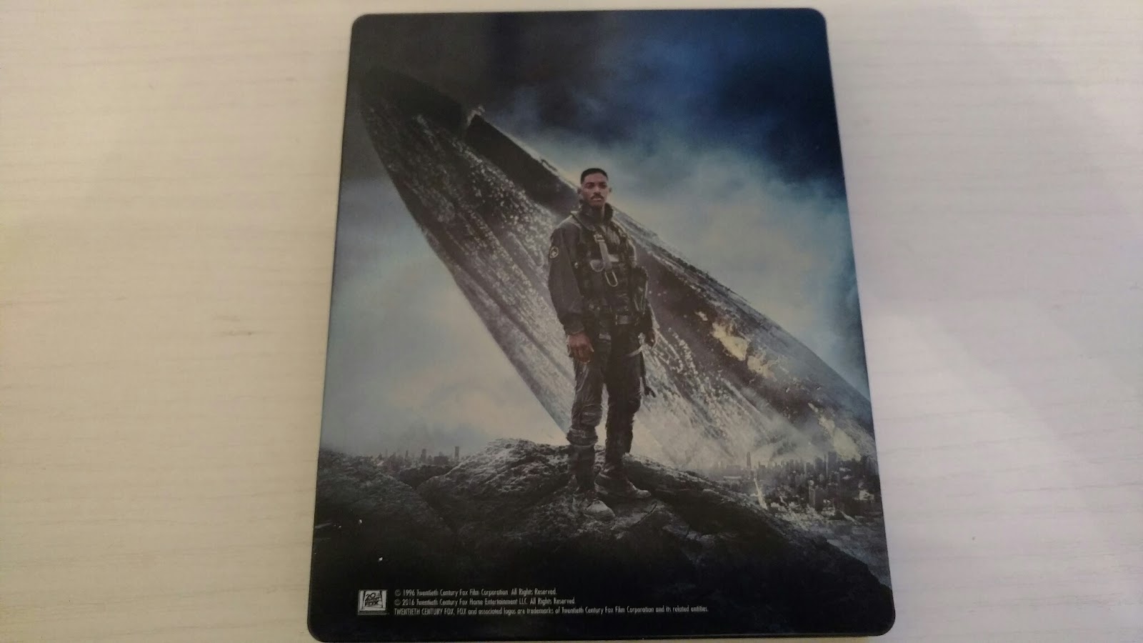 Veniamo ora però alla versione bluray che è quella che mi fa sfregare la mani. Si tratta della ID4 Alien Attacker Edition , ma grazie agli esperti del gruppo di collezionismo mi sono procurato quella francese: uguale in tutto (audio italiano compreso, anche se dalle specifiche non risulta), ma con custodia steelbook. E se si considera che costa anche circa venti euro meno (a cui vanno aggiunte le spese di spedizione) è veramente un affare prenderlo su Amazon transalpino. Vediamo adesso cosa è presente nella confezione: abbiamo un modellino, solido, ben fatto dettagliatissimo, della navicella spaziale aliena. Più grande del palmo di una mano, è stabile grazie al piedistallo di forma circolare con impresso “Independence Day” sul fronte. Abbiamo anche un libretto fotografico, corredato con poche scritte in francese, di 14 pagine. Purtroppo le dimensioni sono leggermente sovradimensionate rispetto alla steelbook quindi non è possibile contenerlo al suo interno. La custodia è invece ben fatta, con colori accattivanti e soprattutto il titolo sulla costola, disegnata e colorata sia fronte che retro. All’interno contiene i due dischi, entrambi BD. Nel primo abbiamo il film, anche in versione estesa, con audio italiano DTS 5.1 e la possibilità di avere il commento. Il secondo contiene tutti gli extra con sottotitoli in italiano: